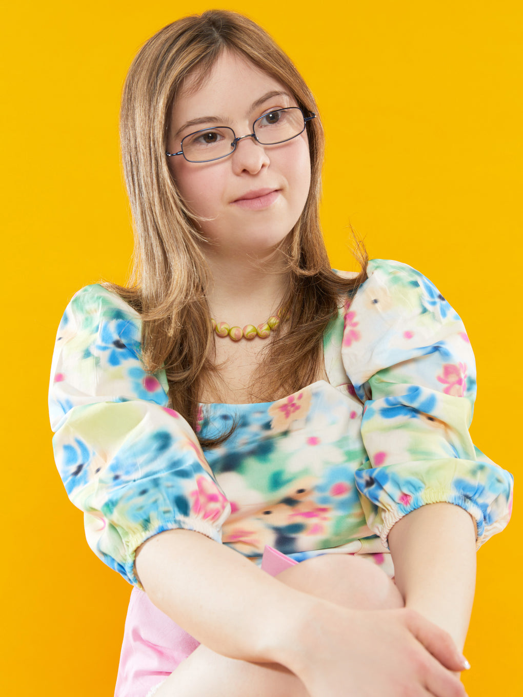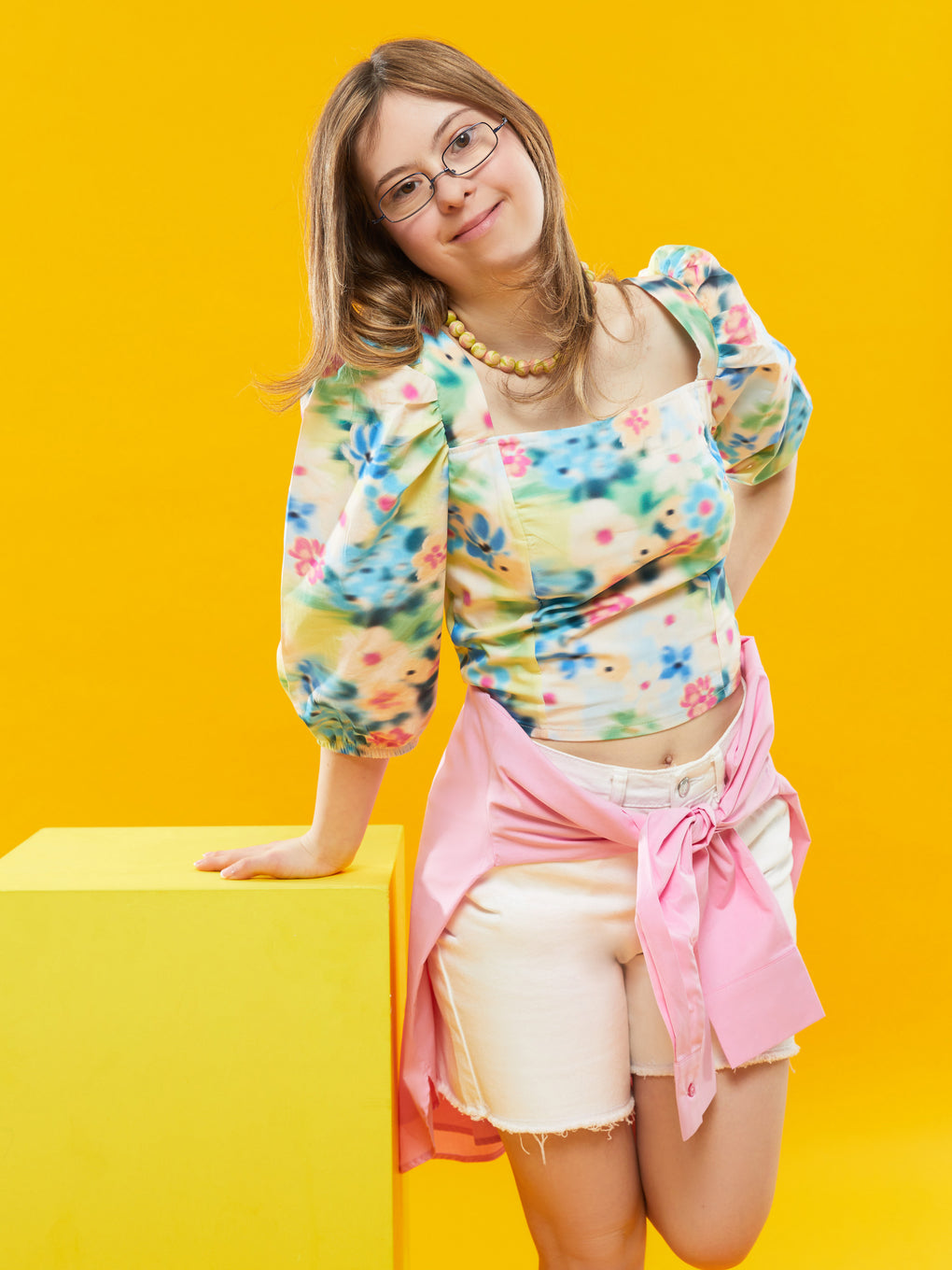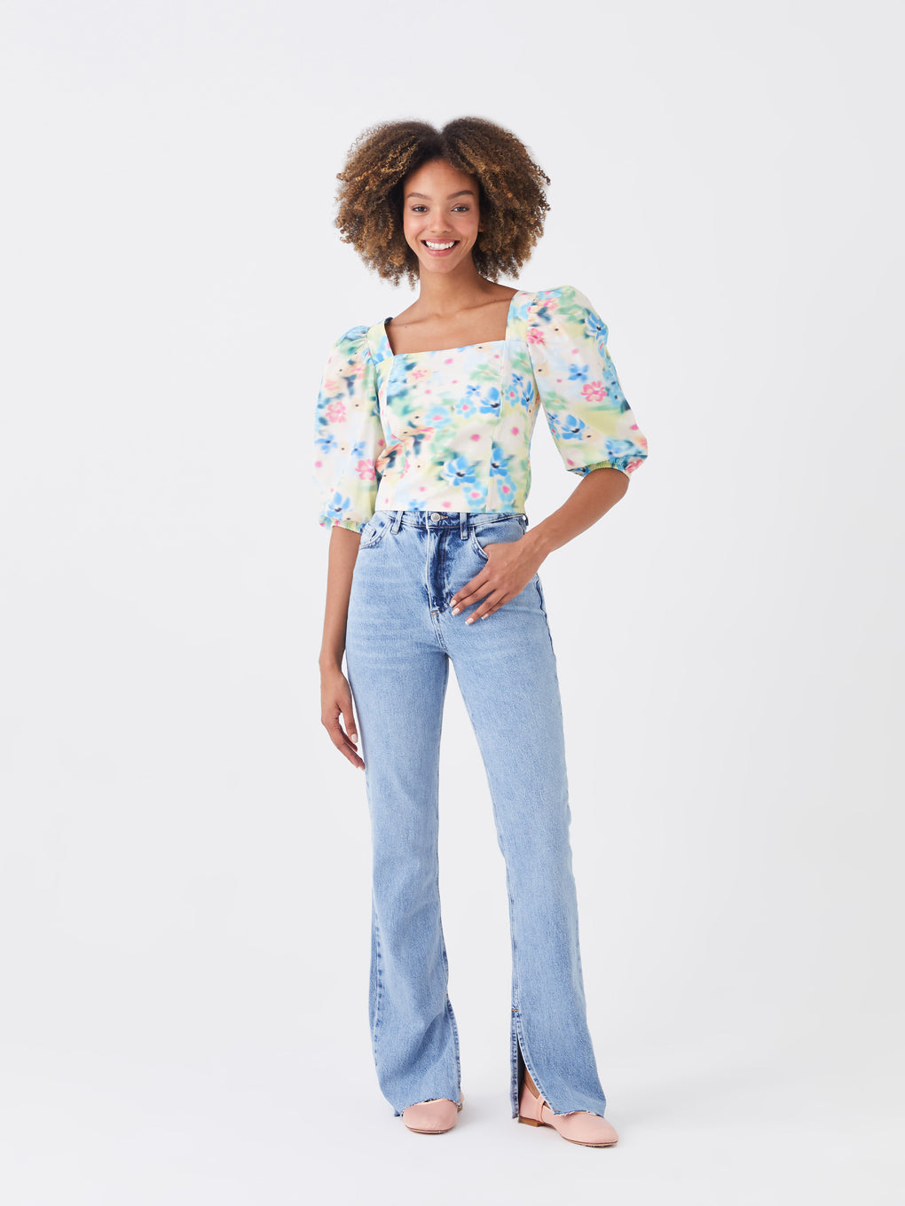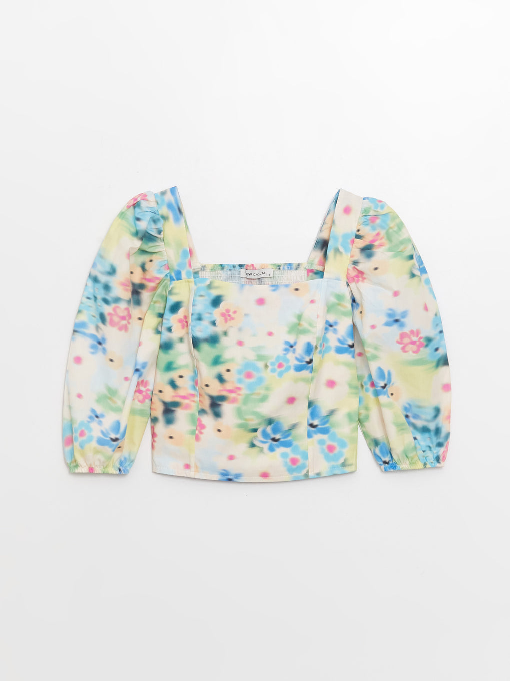 Square Neck Floral Balloon Sleeve Crop Women's Blouse
