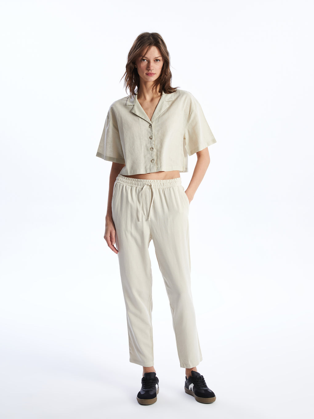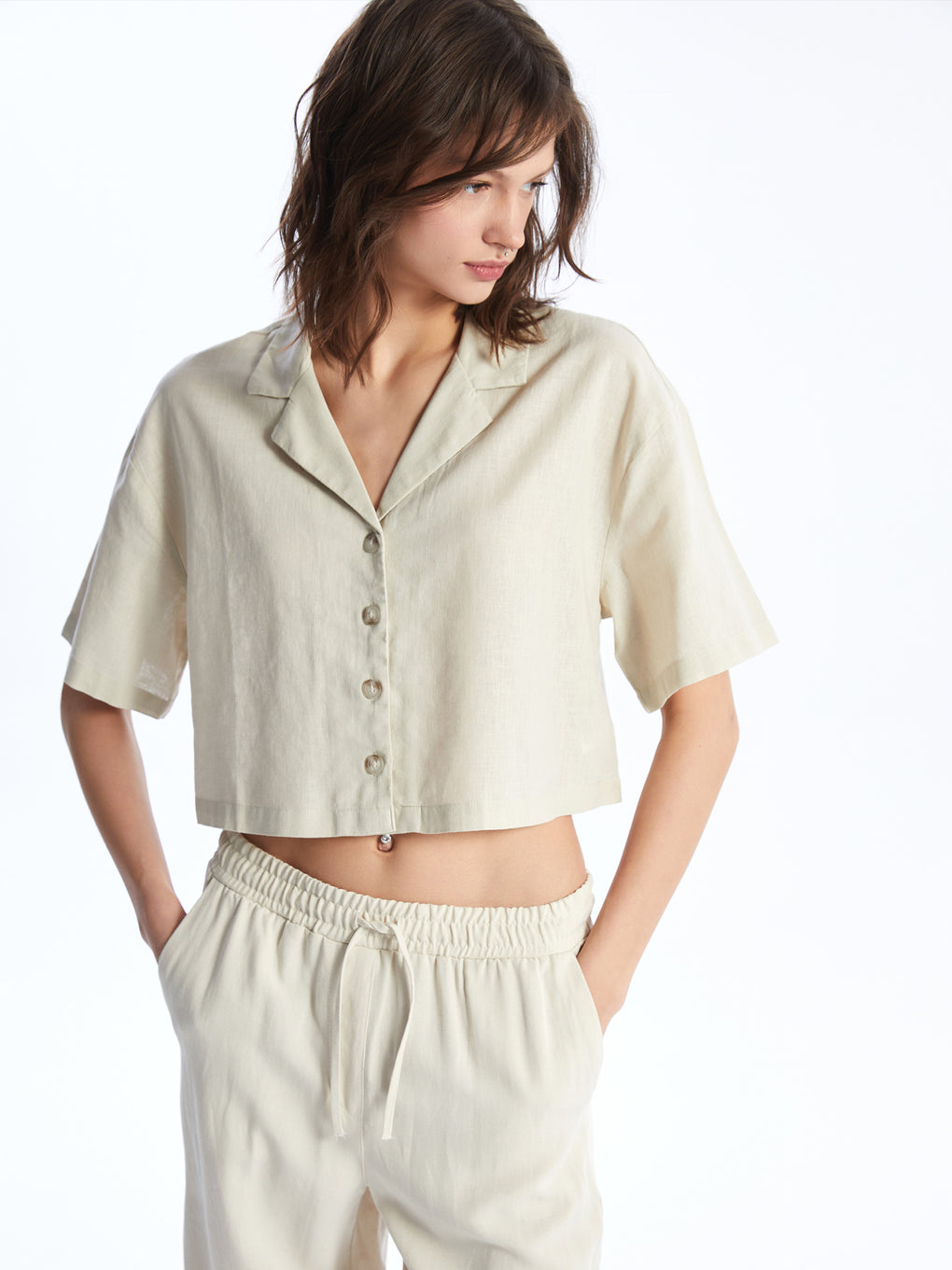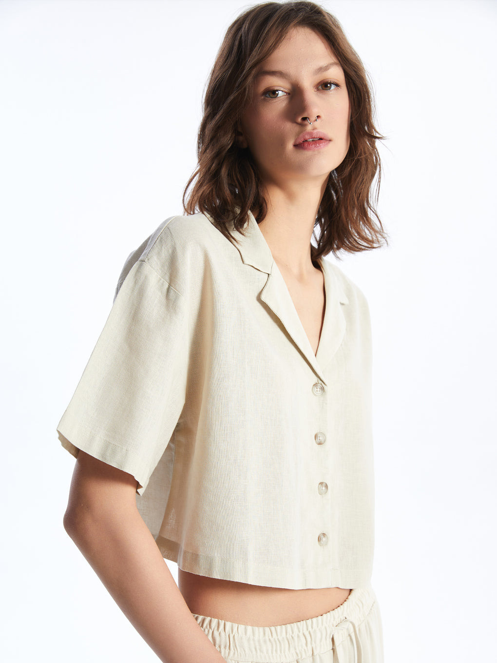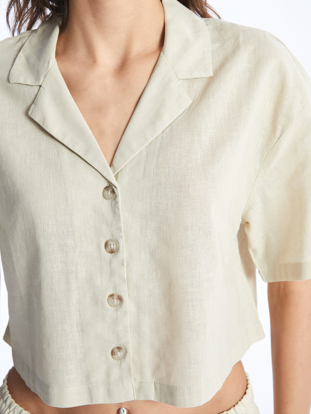 Straight Short Sleeve Crop Linen Blend Women's Shirt