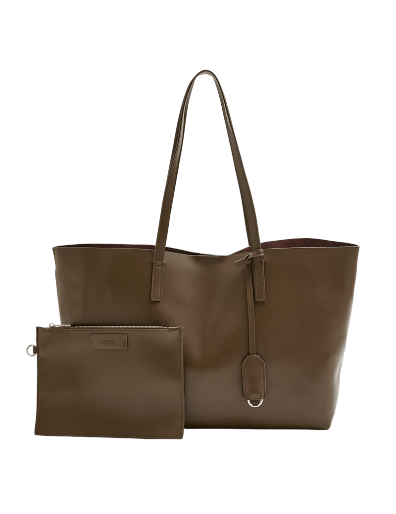 This faux leather shopper is a practical yet stylish choice for busy days. It features a magnetic closure and a detachable zipped purse to keep your belongings secure. The top handles allow for easy carrying.