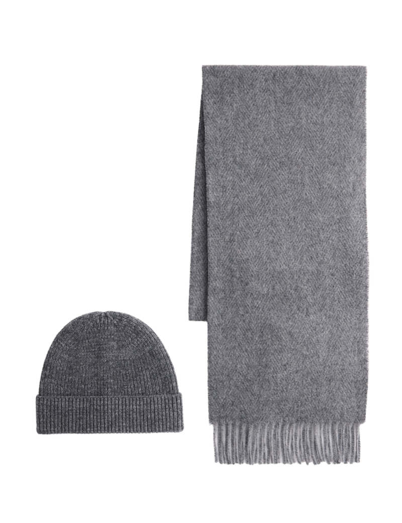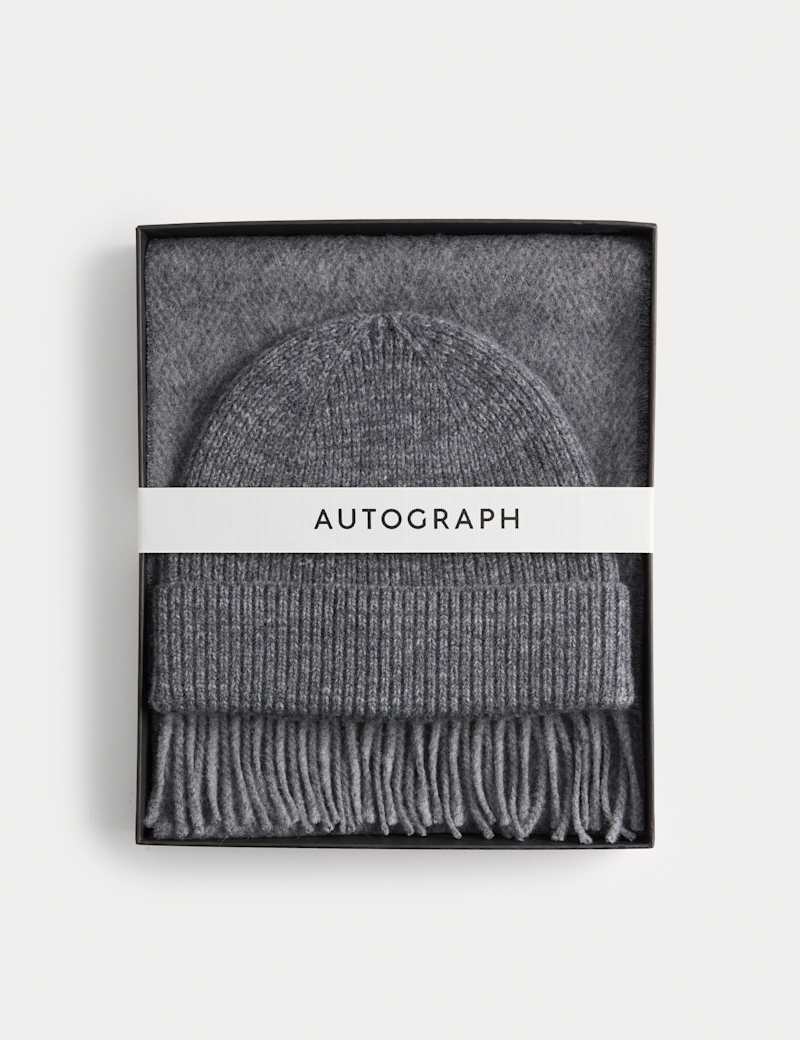 This super-soft hat and scarf set from our Autograph collection is knitted from super-soft pure merino wool. The scarf features a timeless herringbone pattern. The ribbed hat has a turned-up brim. Presented in a branded box, it makes a great gift.