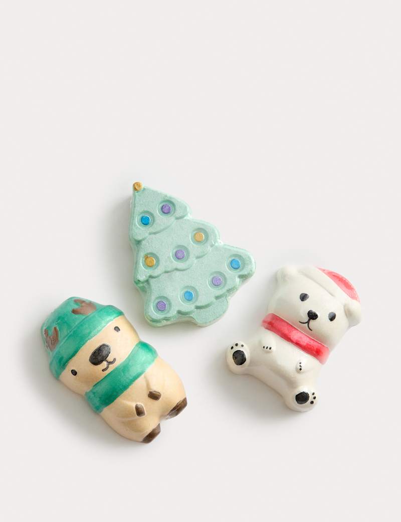 Add a festive feel to bath time with this fizzer set from Bloom. This trio includes an adorable reindeer, a polar bear and a pine tree complete with decorations. Just place under warm running water for a seasonal soak in the bath.