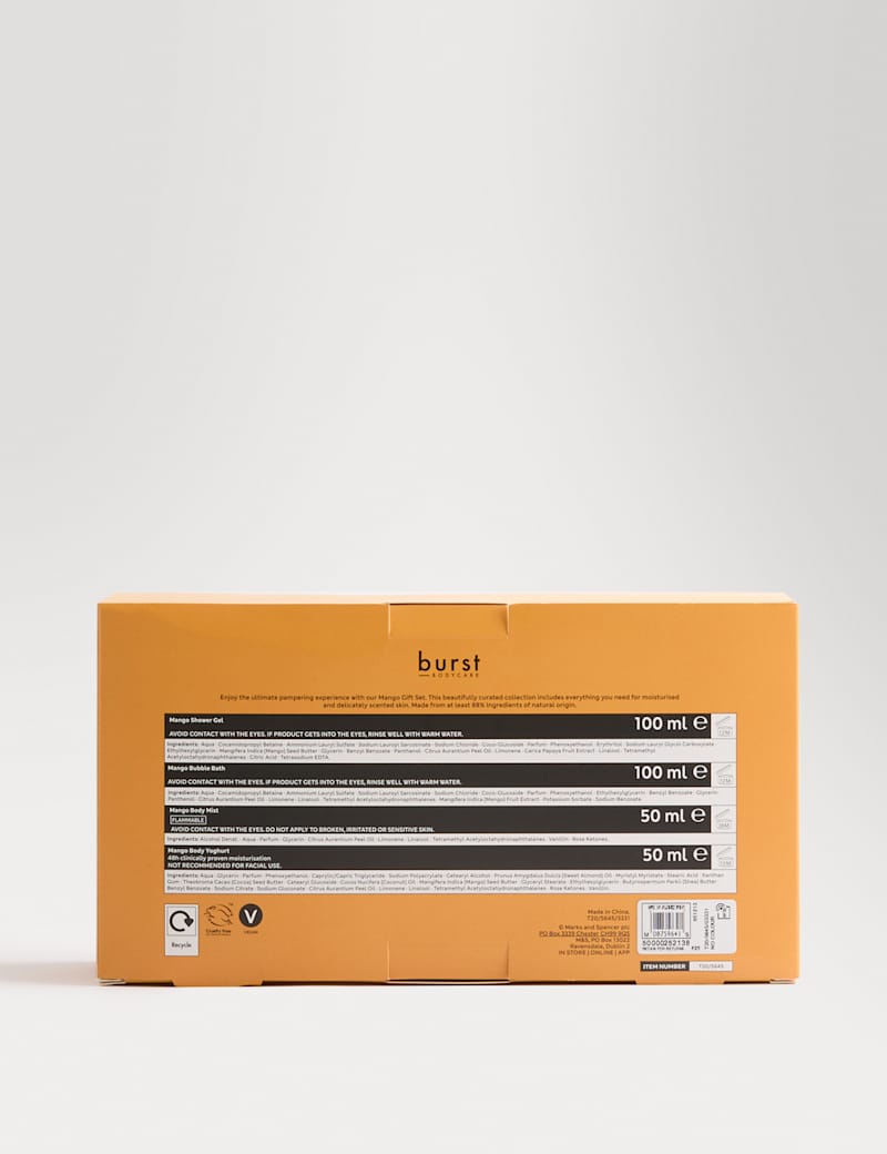 Enjoy bright, tropical notes of juicy mango with this four-piece collection from Burst Bodycare. This pampering set includes a cleansing shower gel, a foaming bubble bath and a moisturising body yoghurt. Spray the scented body mist for a bright burst of fragrance wherever you are.