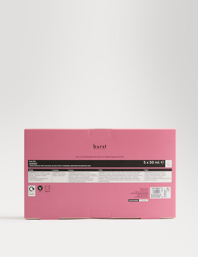 This Burst Bodycare body mist collection makes a fun fragrance treat for yourself or a friend. The set includes five mini sprays in shea, aloe, cherry, coconut and mango – each the perfect size for delivering a light burst of scent on the go.