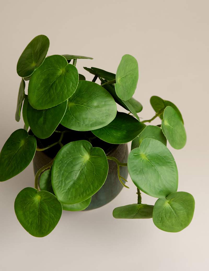 This artificial money plant is the perfect way to add a touch of nature to your home. It's housed in a round ceramic pot, which features a reactive glaze, making each piece unique.