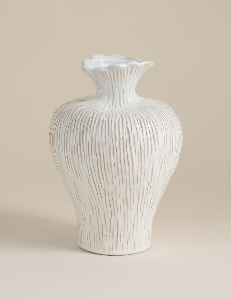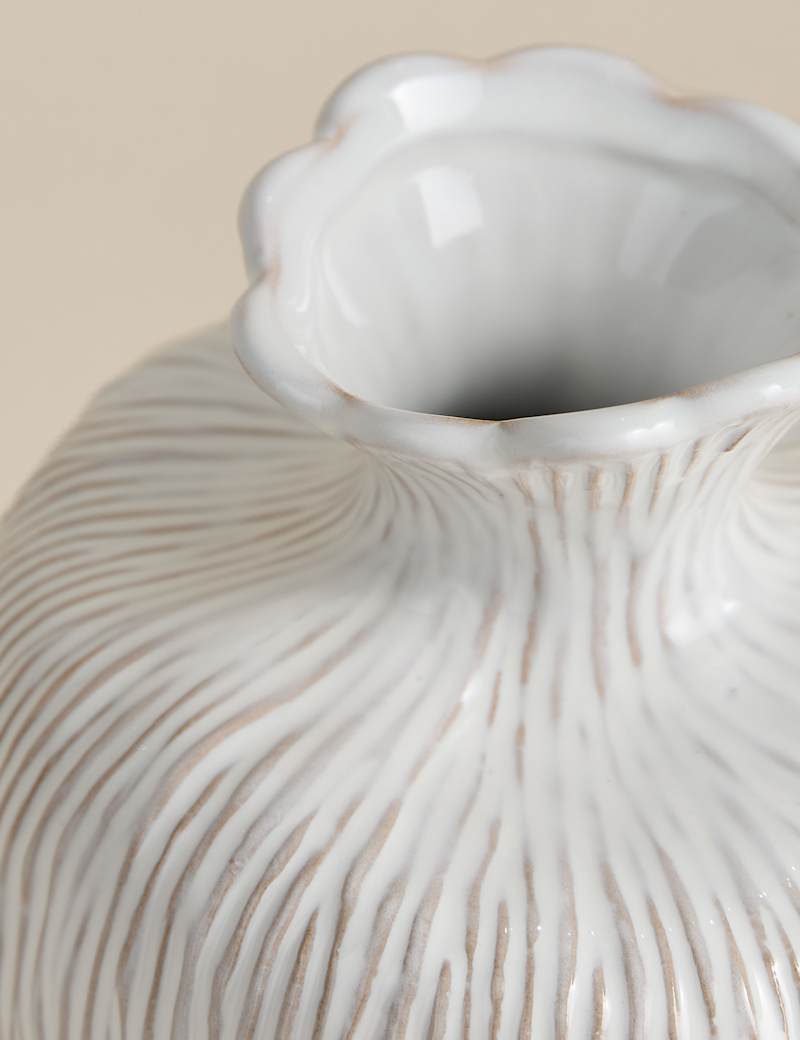 This ceramic vase features a tactile organic form, lending it a unique nature-inspired look. It's crafted with a scalloped rim and has a delightfully textured finish.