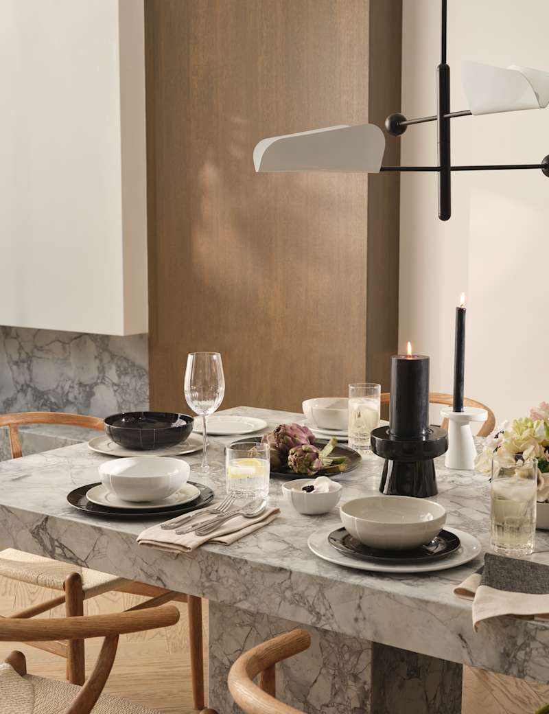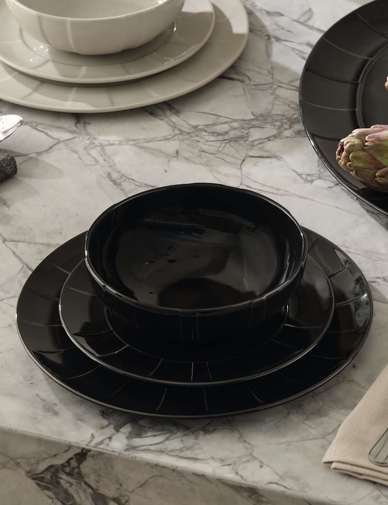 This stoneware dinner set brings a contemporary feel to your dining table. The 12-piece collection features a distinctive ridged design with textured detailing for added interest. Each set includes four dinner plates, four side plates and four bowls, all with a modern, monochromatic aesthetic. The pieces are dishwasher safe for easy cleaning after mealtimes.