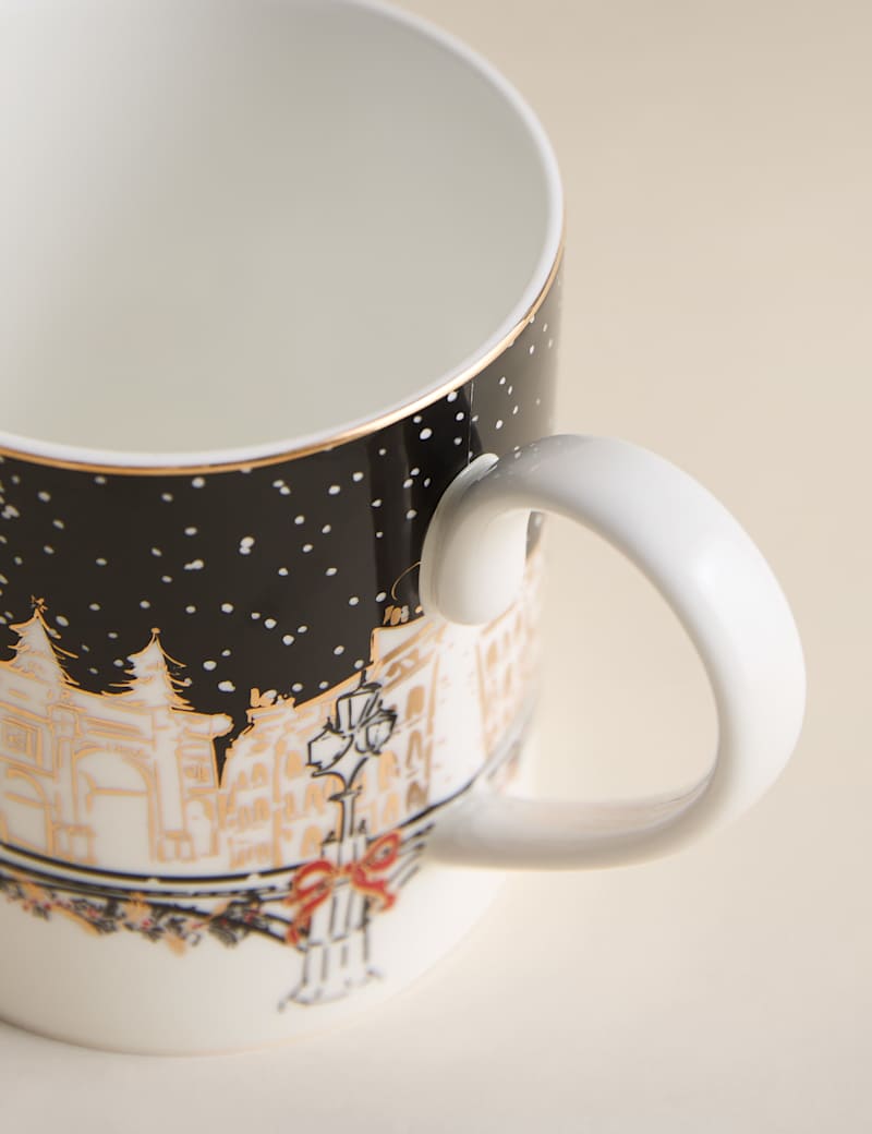 Welcome in the winter season with this playful china mug. Its intricate street scene shows a festively decorated London bridge. In the sky above, reindeer are pulling Santa's sleigh.