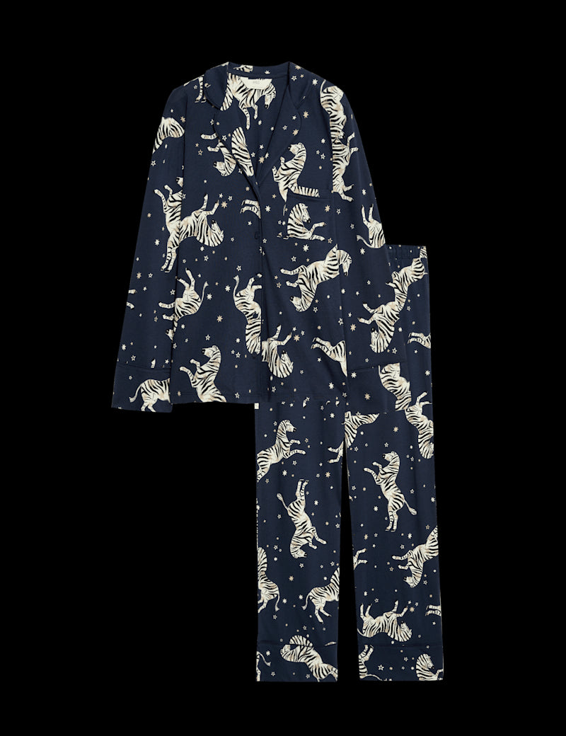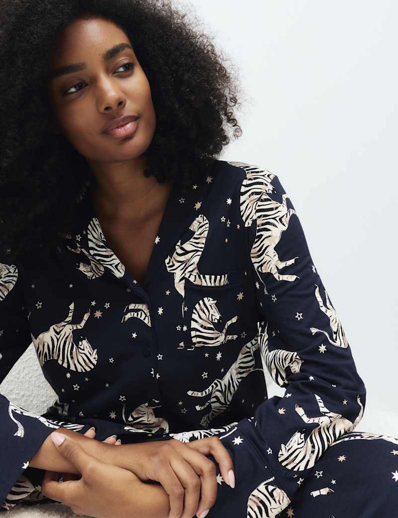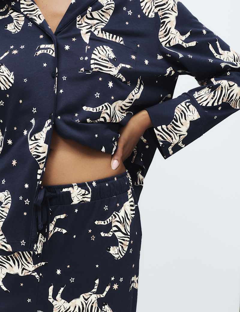 This cotton-modal pyjama set is decorated with a playful print of zebras among twinkling stars. Regular fit. Features a revere collar, button-through shirt and elasticated tie-waist bottoms. Cool Comfort™ technology helps regulate your temperature for a comfortable night’s sleep.