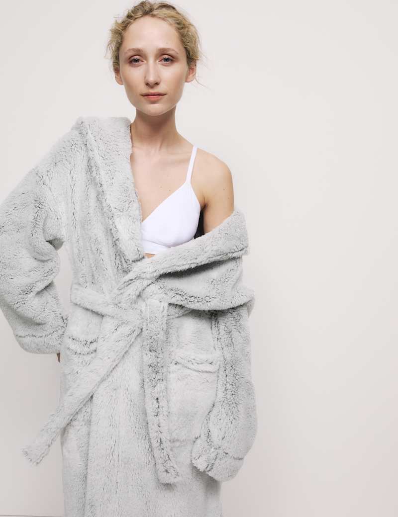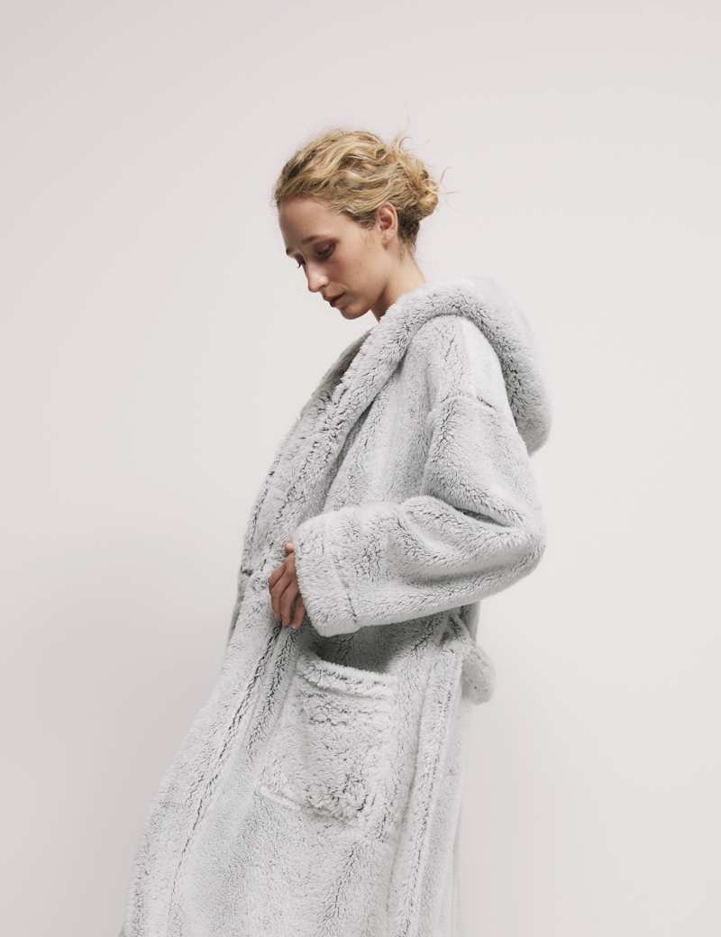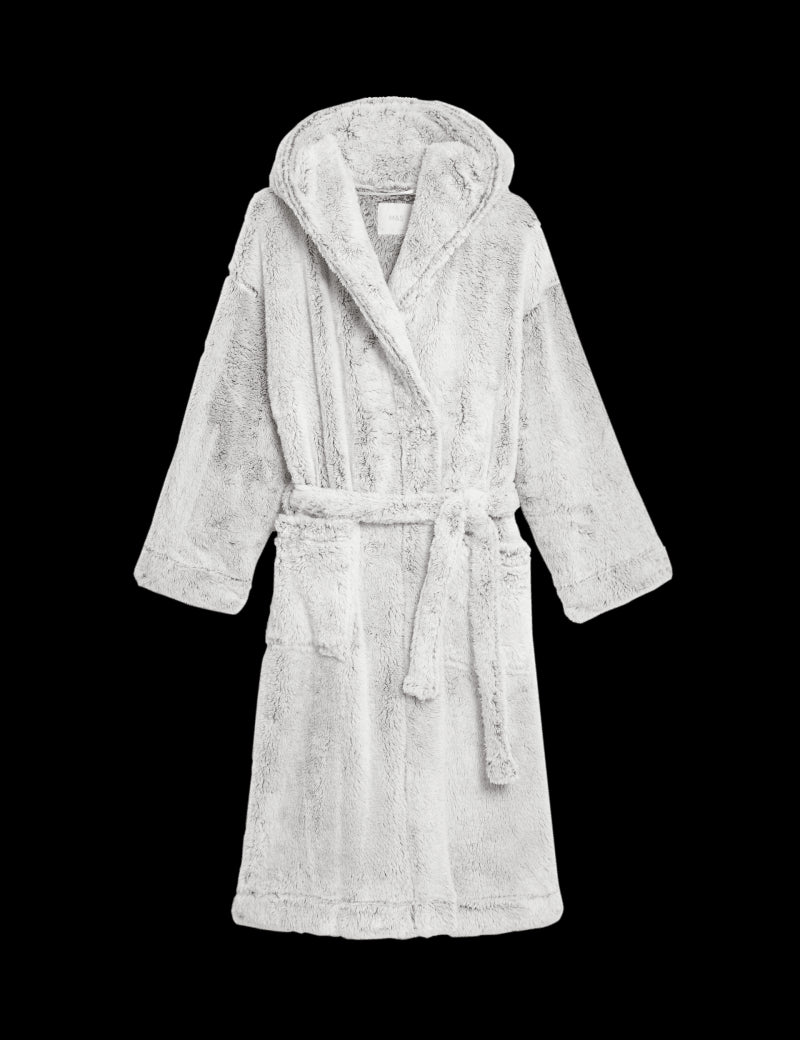 Lounge around in pure comfort with this snuggly dressing grown. Designed in a long length with a belt fastening and handy side pockets. Hooded design for extra cosiness. Crafted with a long pile for added texture.
