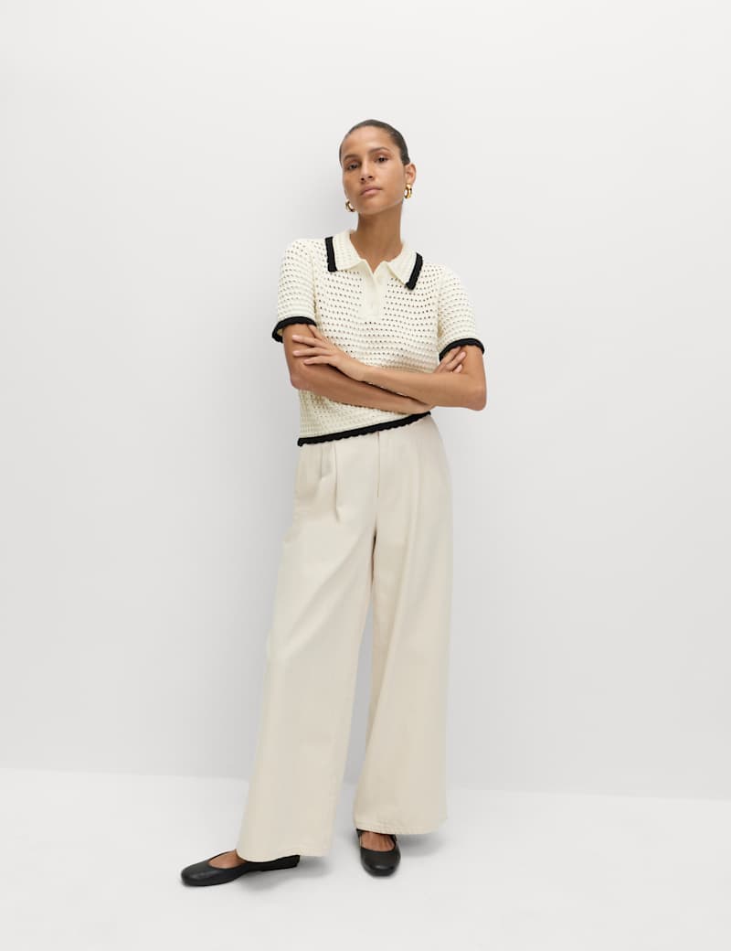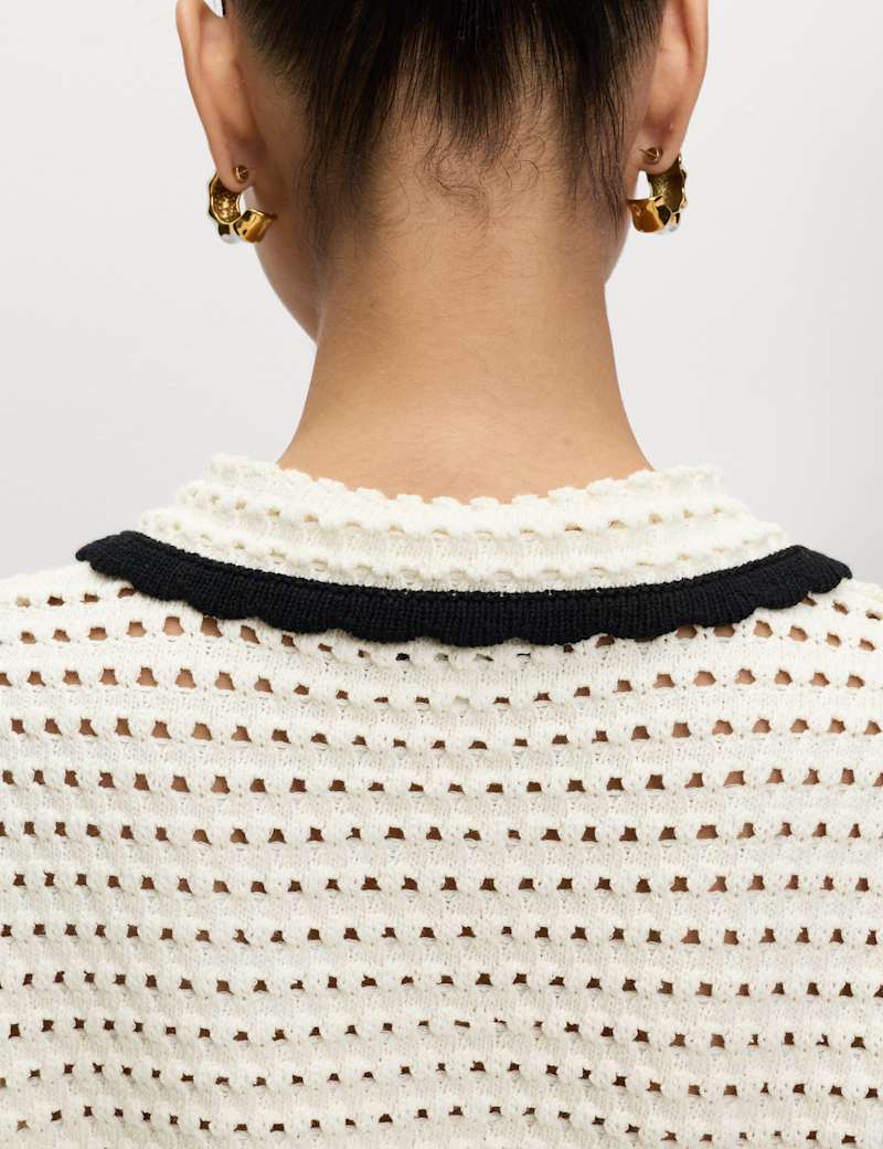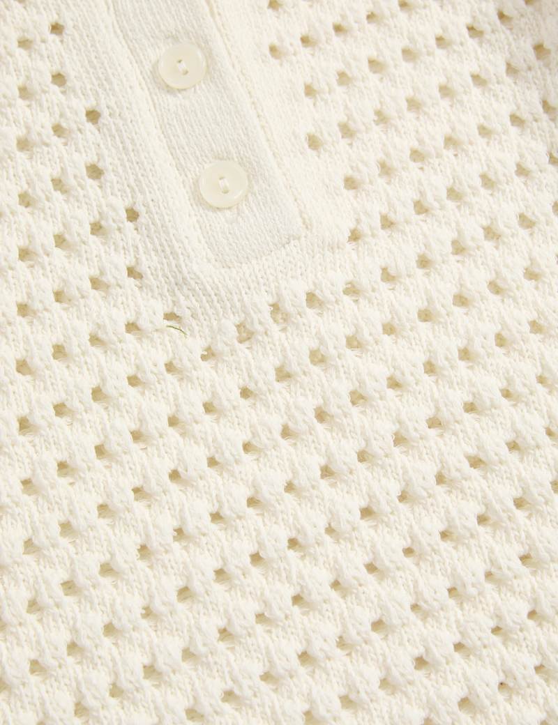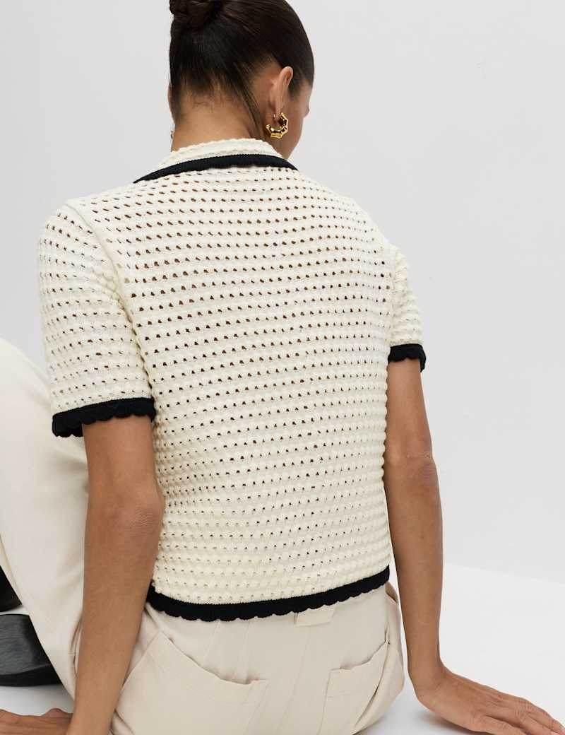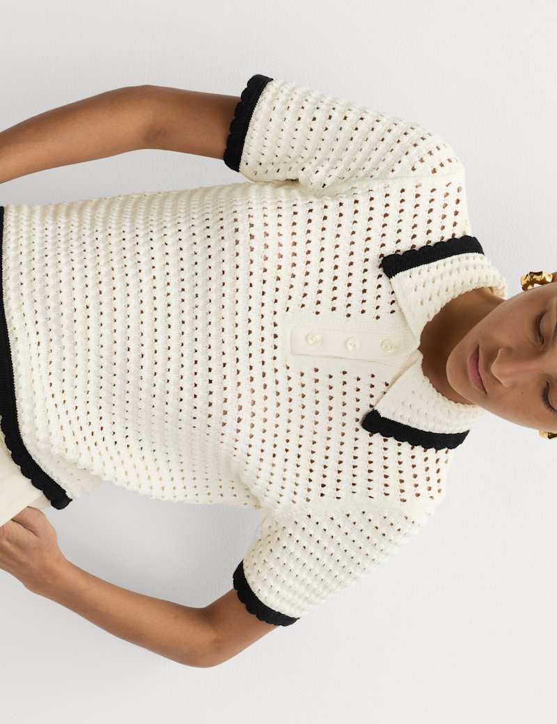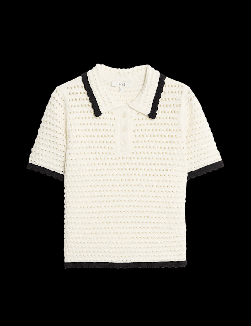 This cotton-rich knitted top offers a contemporary twist on a sporty classic. It's designed in a regular fit, with an open-stitch texture for breathability. A collared neck and button placket create a smart polo-inspired look. The design is complete with contrasting scalloped trims on the collar, short sleeves and hem for a feminine flourish.
