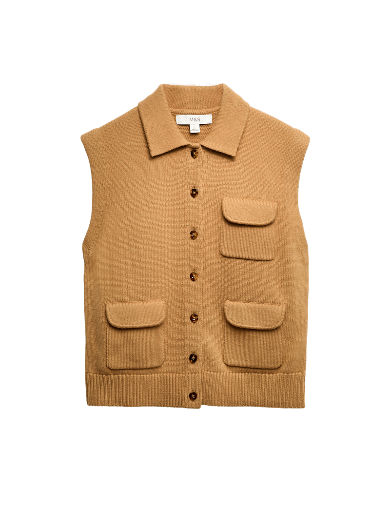 This versatile cotton-rich waistcoat is a stylish addition to your wardrobe. Regular fit, with a smart collared neckline and button fastening. The three front pockets create a utilitarian-style appearance. Textured knit for a cosy finish.