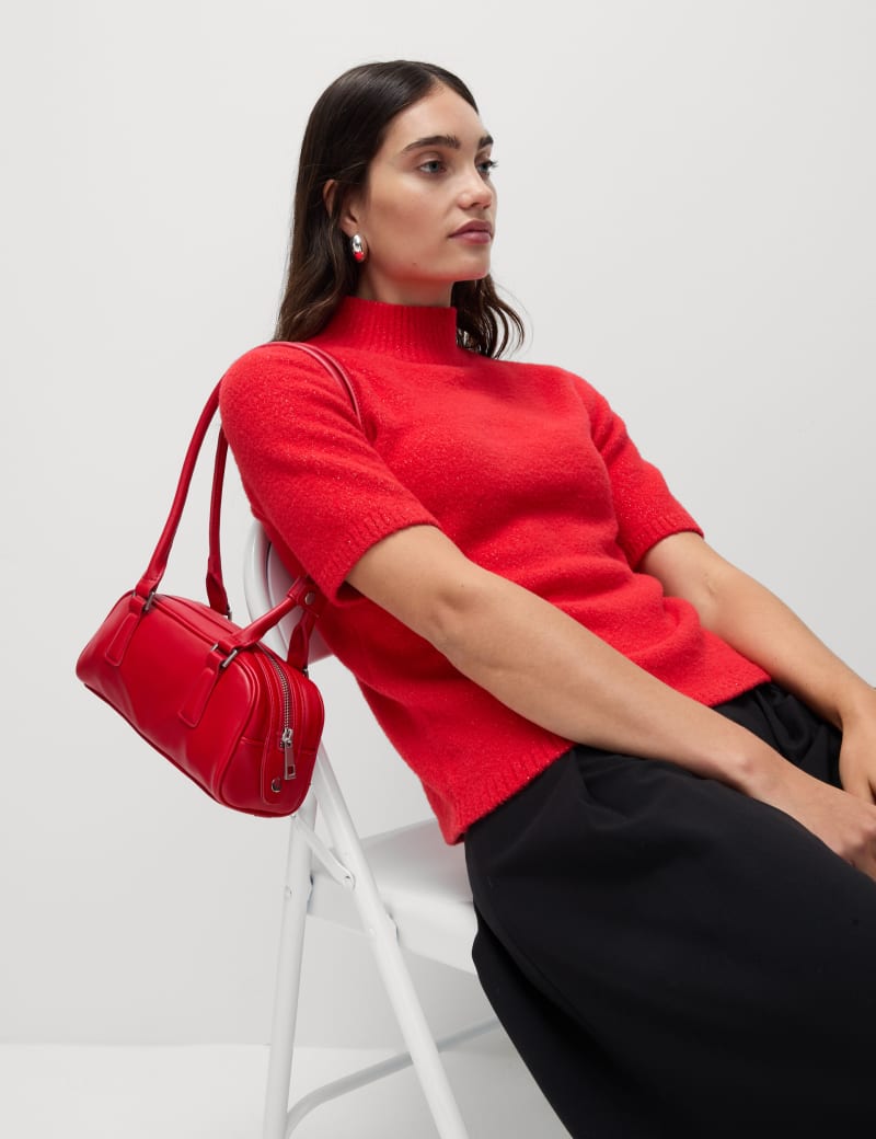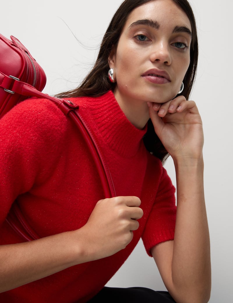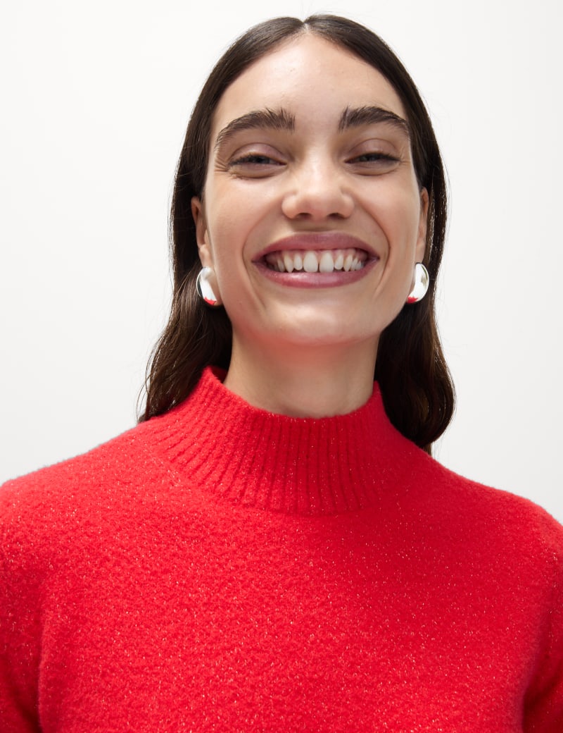 With its shimmering metallic threads, this knitted top will add a touch of glamour to your looks this season. It's made in a slim fit, with a high funnel neck for a contemporary, streamlined look. Airy short sleeves complete this feminine piece.