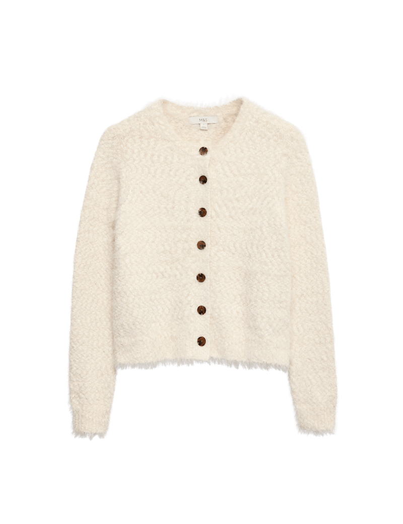 This long-sleeved cardigan is crafted from soft and fluffy textured yarn for a sumptuously cosy feel. It's designed in an easy regular fit, with a timeless crew neck and a neat button-through front. The hem is slightly cropped for a contemporary silhouette.