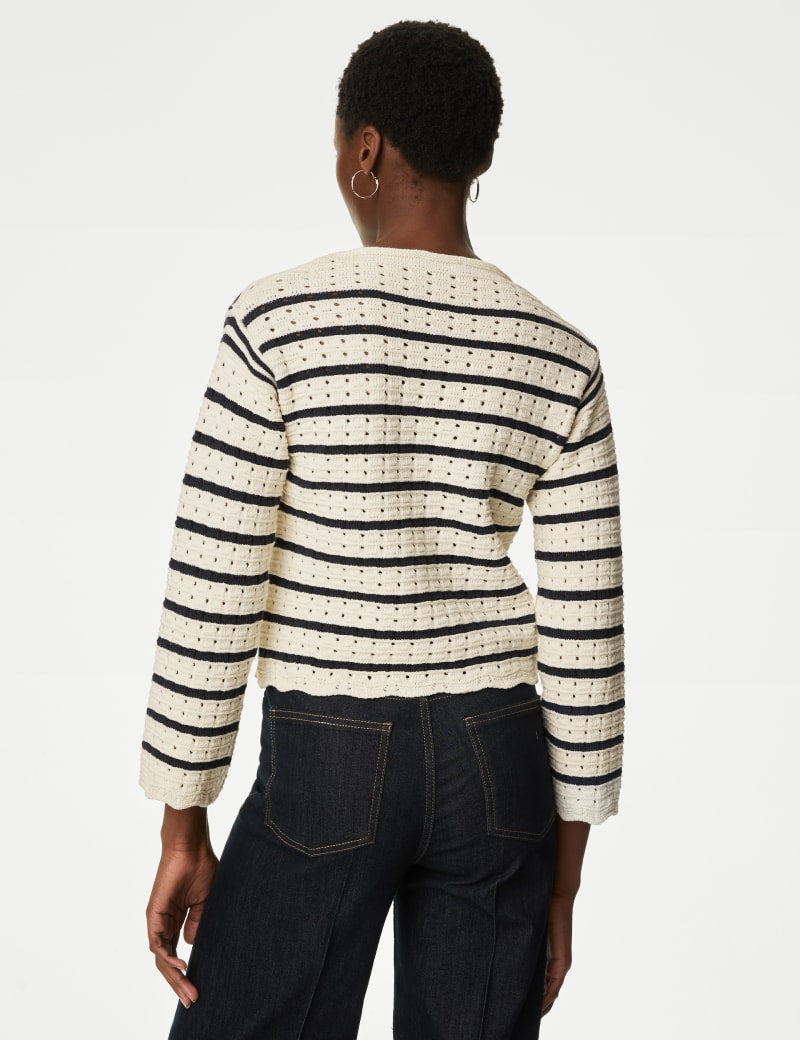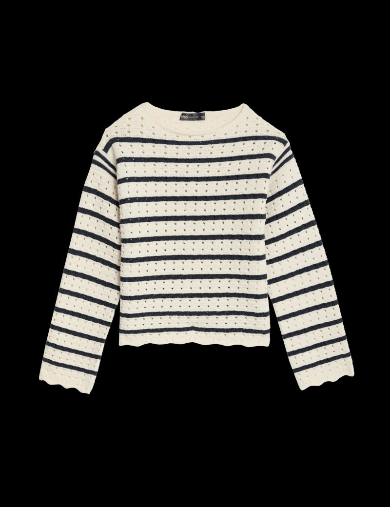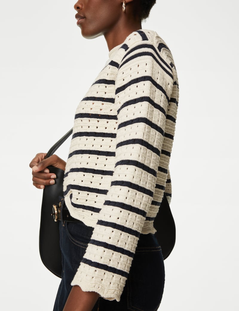 With its neat striped crochet-inspired design and pretty crochet detailing, this cotton-rich jumper will add some texture to your knitwear collection. It's made in a regular fit, with a comfy crew neckline. The long sleeves and hem are finished with a scallop trim for a dainty look and feel.