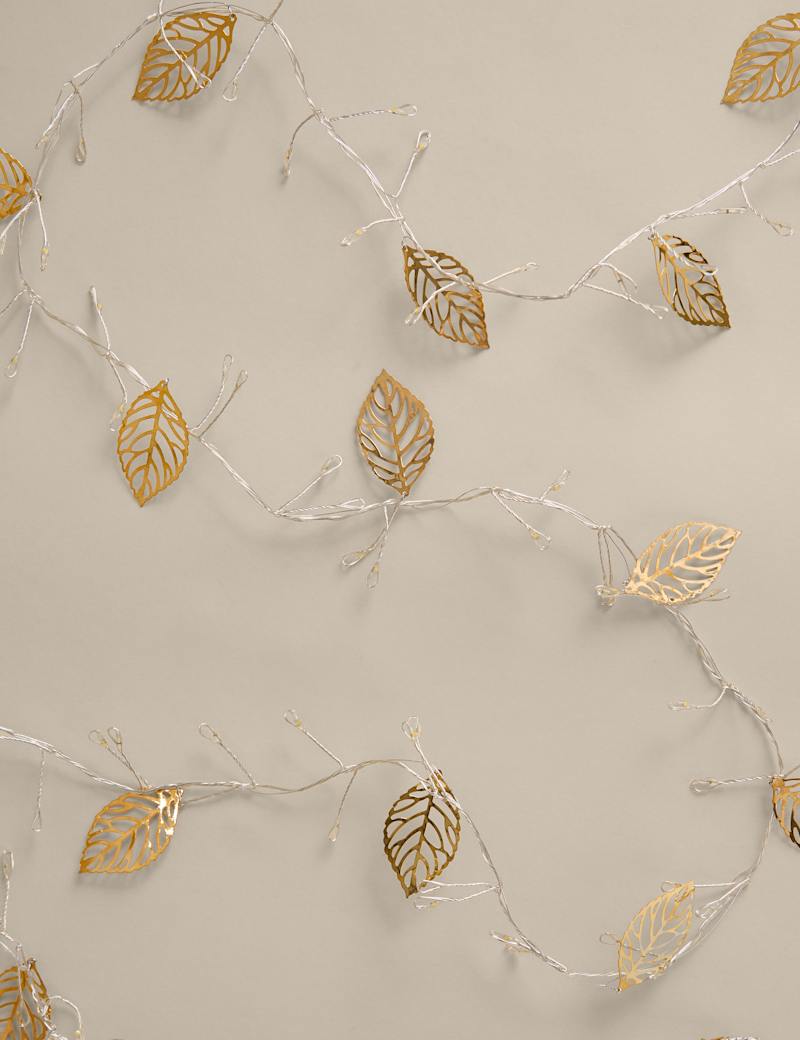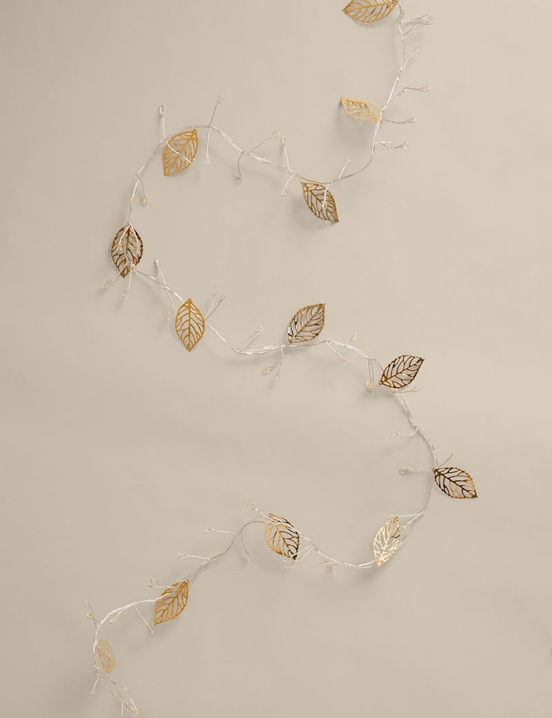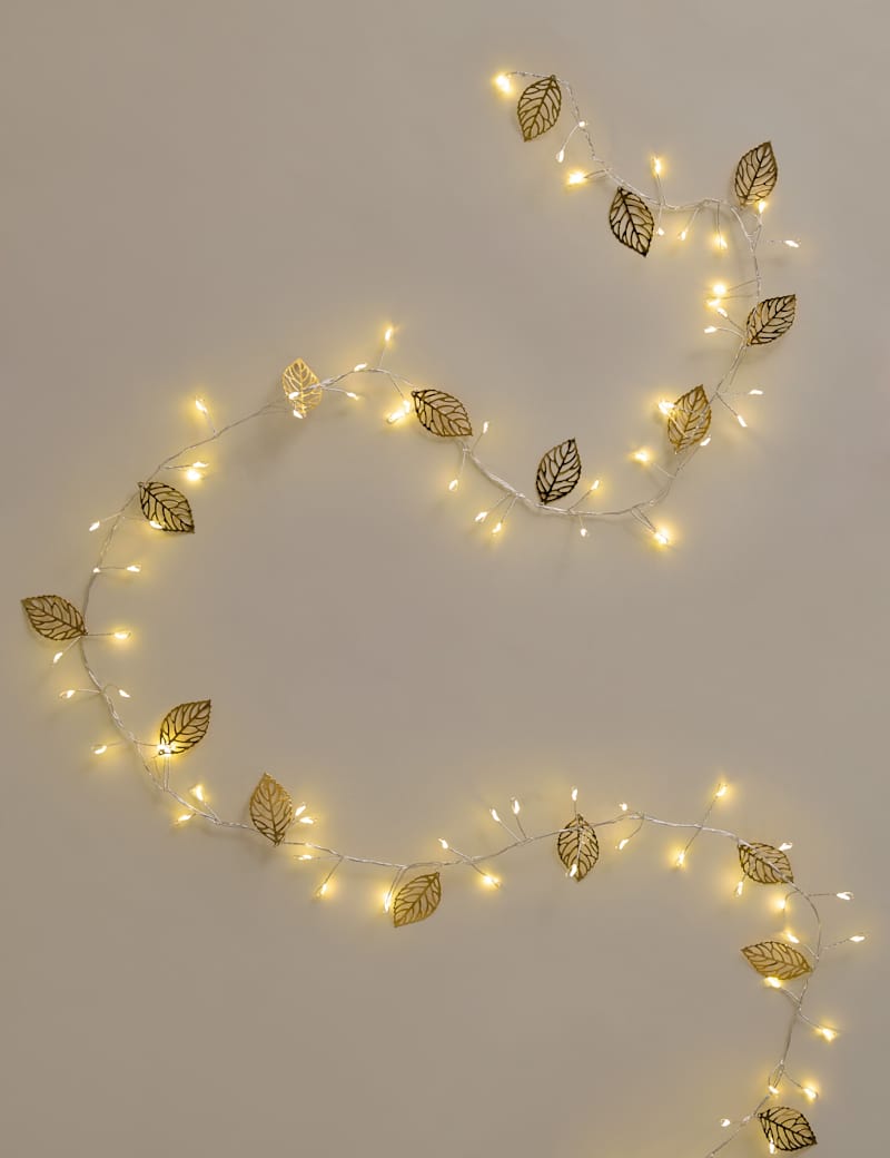 Add some seasonal shimmer to your home with this elegant garland. This design features gold-tone leaves and is entwined with LED lights which provide a gentle glow.