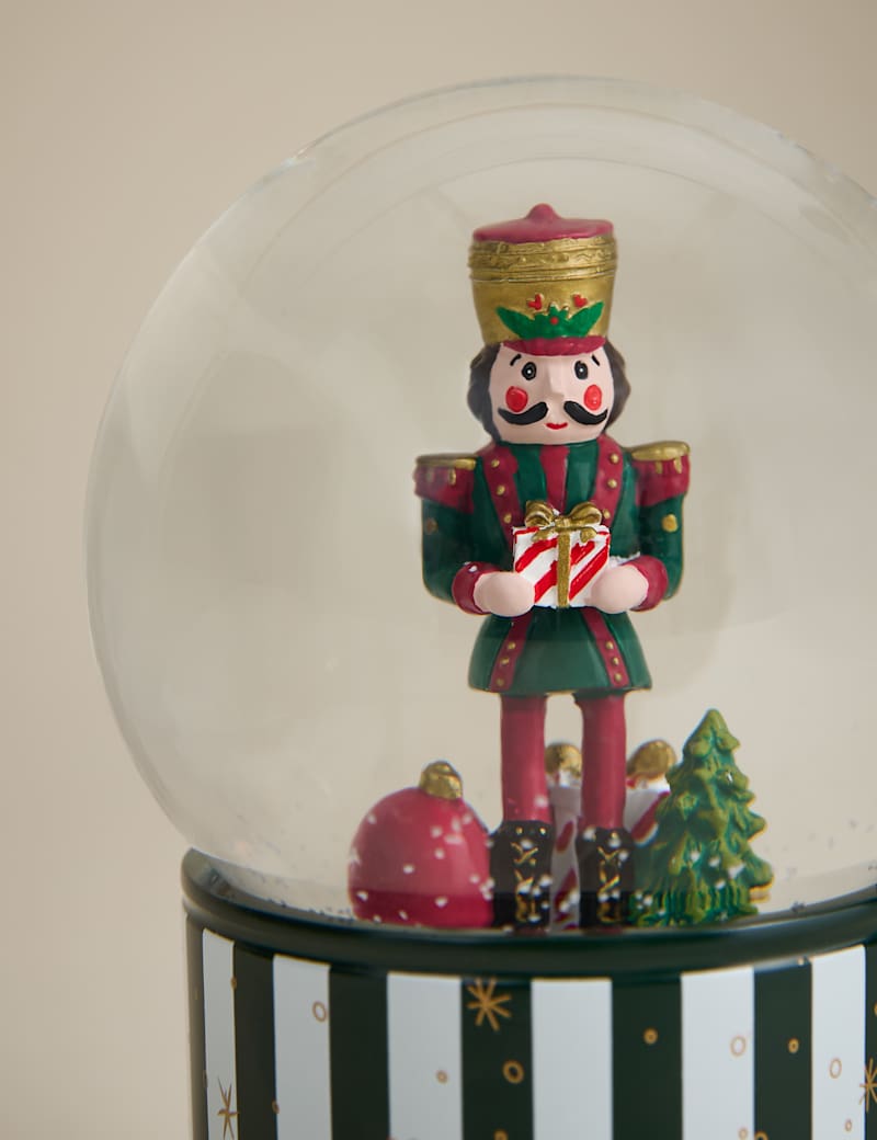 Bring the magic of the Nutcracker to your home with this enchanting snow globe. Inside the globe, a traditional Nutcracker figurine stands amid a flurry of snowflakes. Fan technology ensures an everlasting snowy scene, complemented by melodies that evoke the festive spirit.