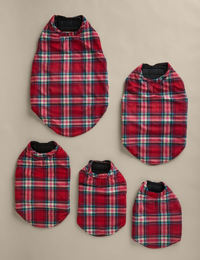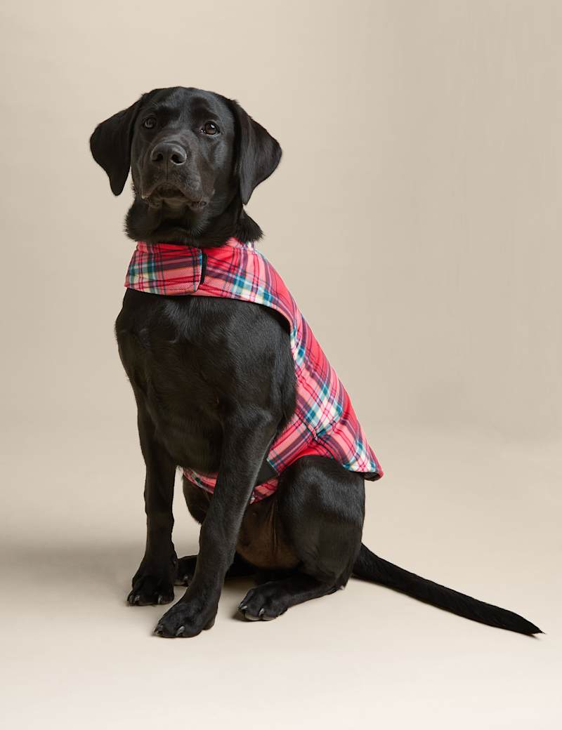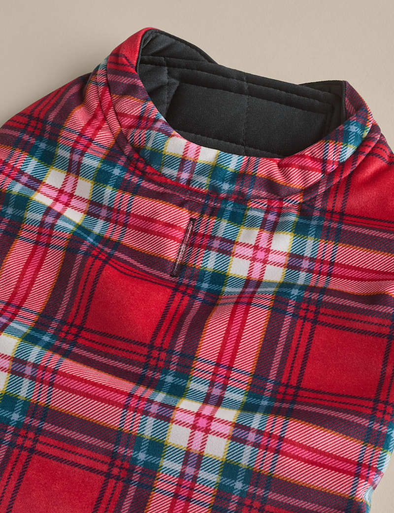 Keep your pooch snug on chilly days in this tartan dog jumper. It's made with riptape fastenings for easy dressing and is quilted for warmth. A slit in the back allows their lead to pass through. Choose from a selection of sizes to suit your furry friend.