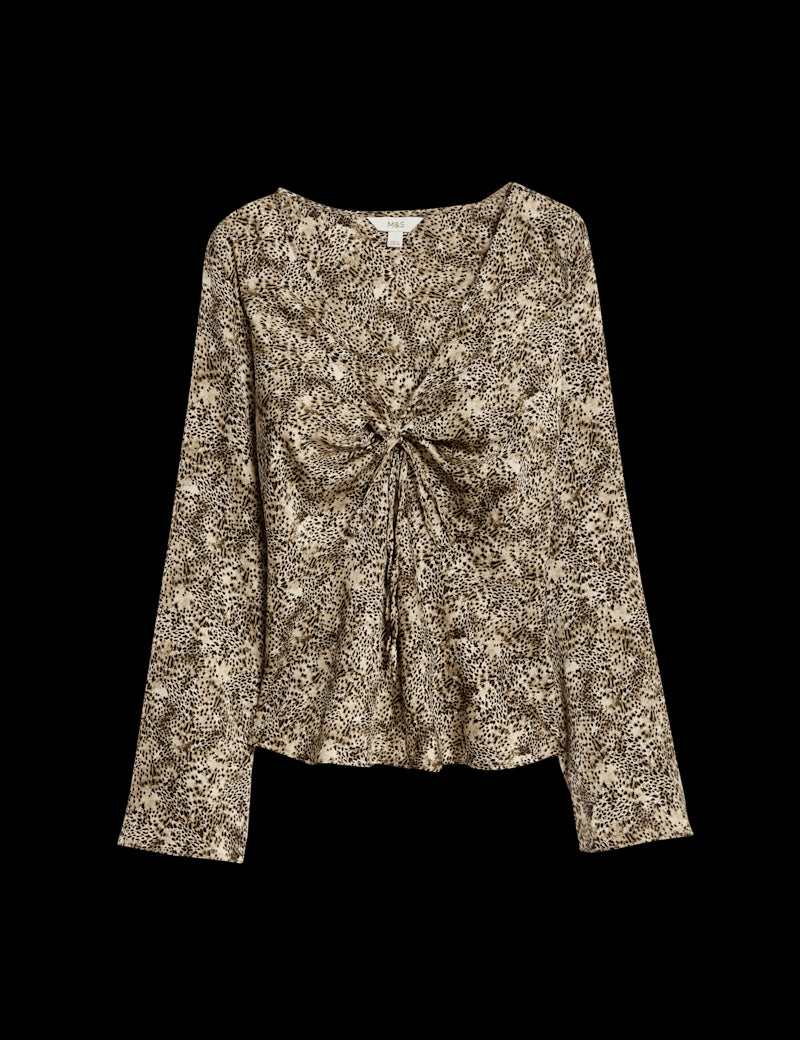 This animal print satin top brings a touch of glamour to your ensemble. It's designed in a regular fit, with long, flared sleeves that move gracefully with you for an elegant, flowing look. At the v-neckline, a tie fastening adds a feminine flourish.