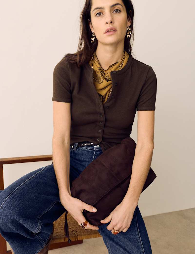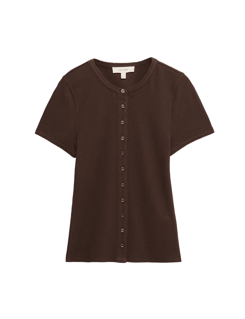 Upgrade your wardrobe staples with this cotton-rich top from our Per Una collection. It's cut in a flattering slim fit, with added stretch in the material for comfortable wear. The short sleeves and crew neckline feature a delicately textured trim, while tonal pearly buttons fasten through the front.