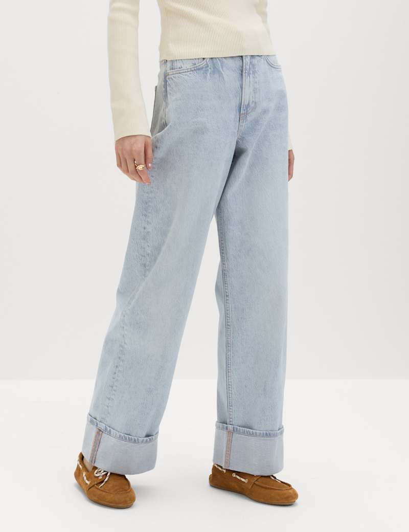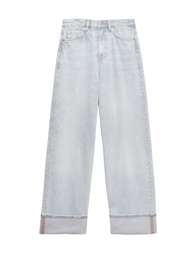 These wide-leg jeans are a stylish pick for casual days. They're designed to fit high on the waist, with a flattering turn-up hem. Made from pure cotton denim for a soft, authentic feel.