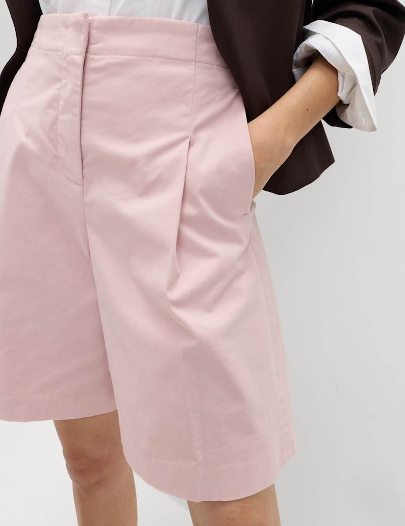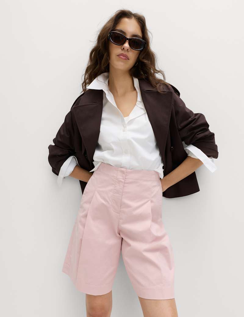 These cotton-rich shorts are a sophisticated take on classic Bermuda styles. Designed in a flattering longline fit with a high-rise waistband and hook bar and zip fastening. Added stretch for comfort. They feature a neat pleated front and two handy side pockets.