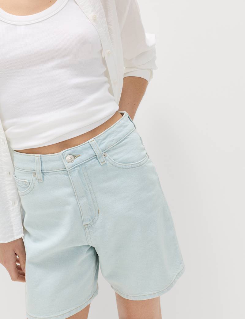 On warm days, casual outfits are sorted with these denim shorts. The pure cotton pair has a comfy regular fit, with a flattering high waist and five pockets. Button and zip fastening.