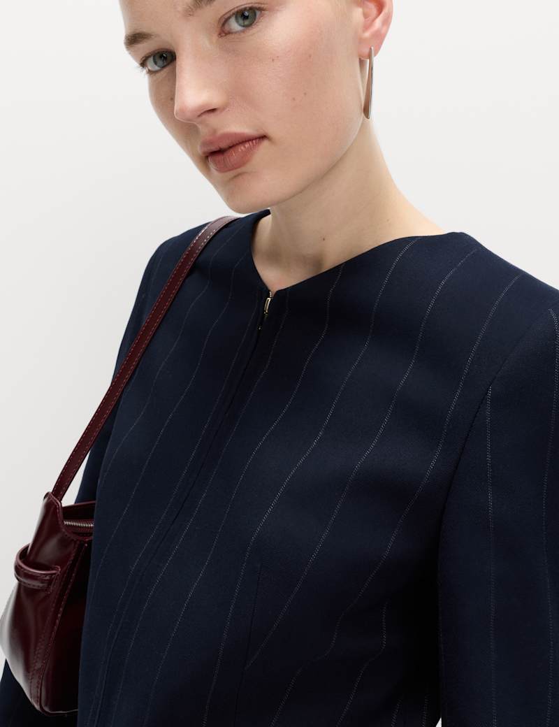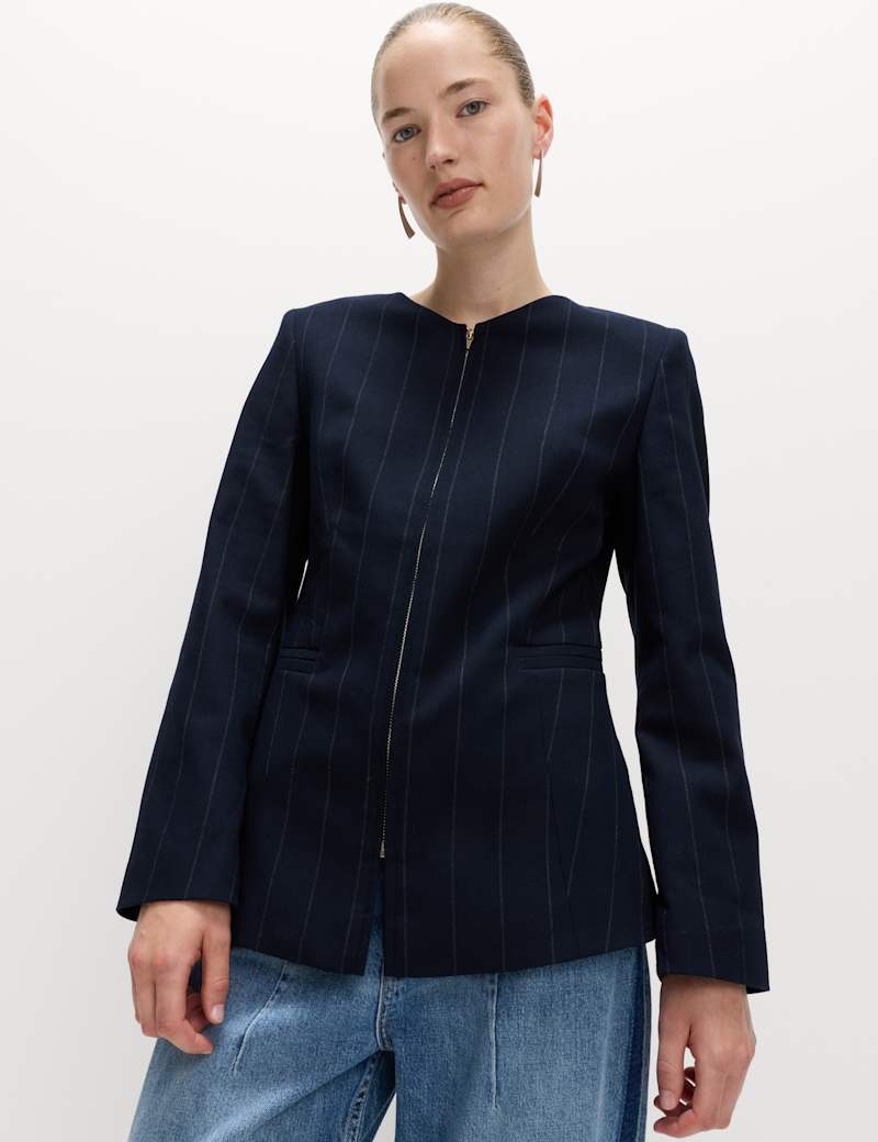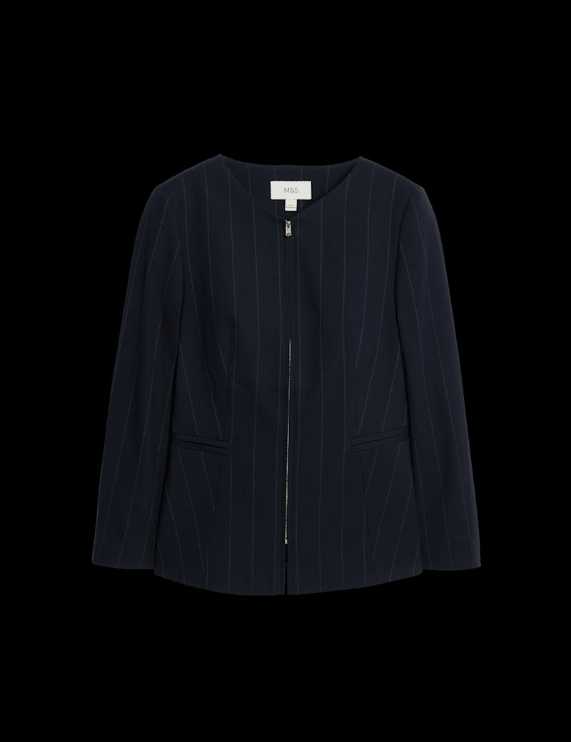 Add a contemporary touch to your look with this smart striped jacket. It's designed in a comfy regular fit, with added stretch for extra comfort. The zip-through front and funnel neck offer a sleek look, while two vent pockets provide a practical finish.
