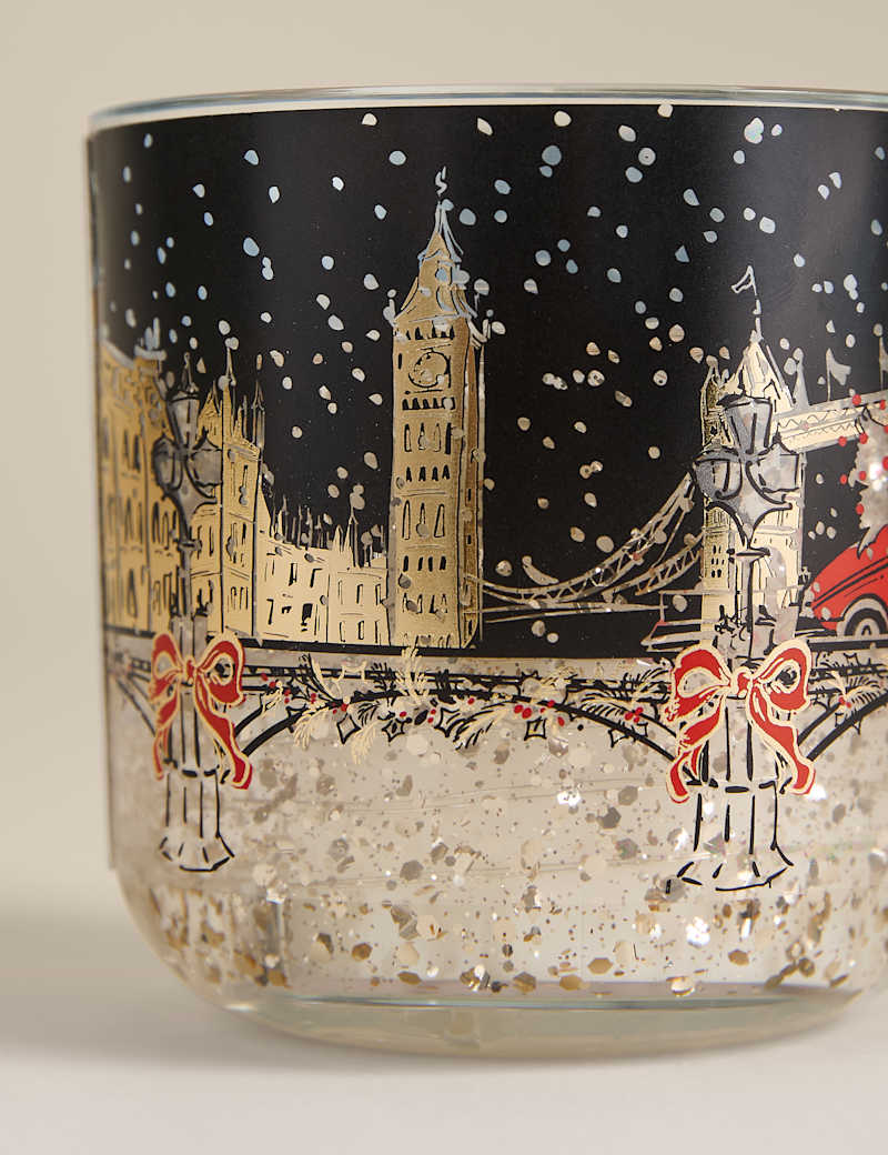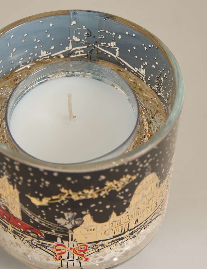 Imagine wandering through the wintery scene evoked in this townhouse Marks & Sparkle™ scented candle. It's medium-sized and sits in a glittery gel-filled glass holder with LEDs inside, which light up when the wick is lit to create a warm, festive glow. Pop this candle at the centre of your table, where it will burn for up to 20 hours.