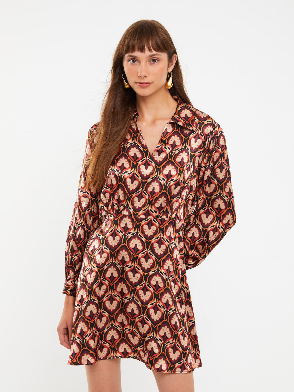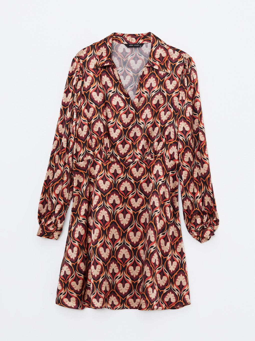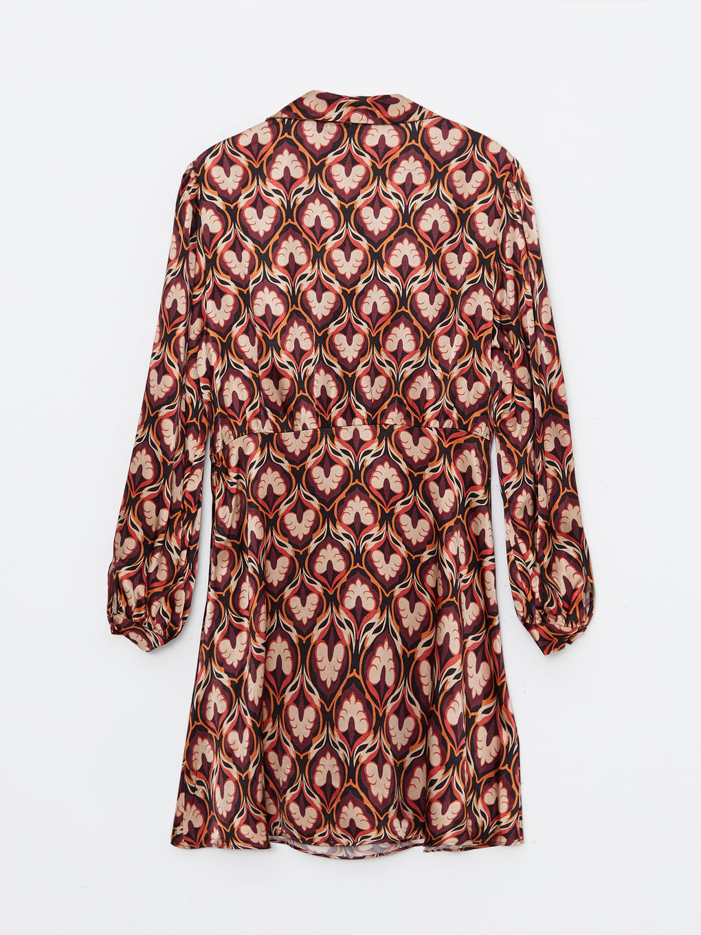 Shirt Neck Patterned Long Sleeve Satin Women's Dress