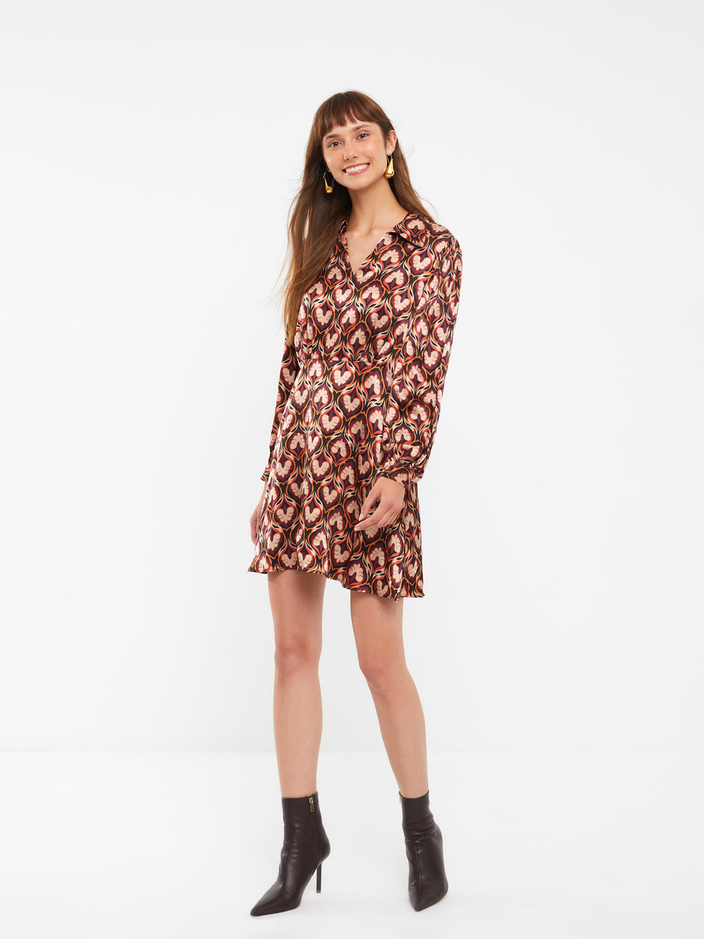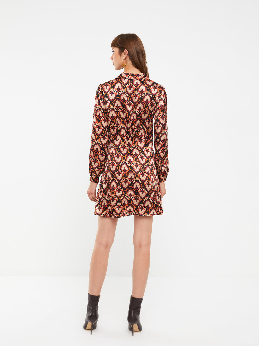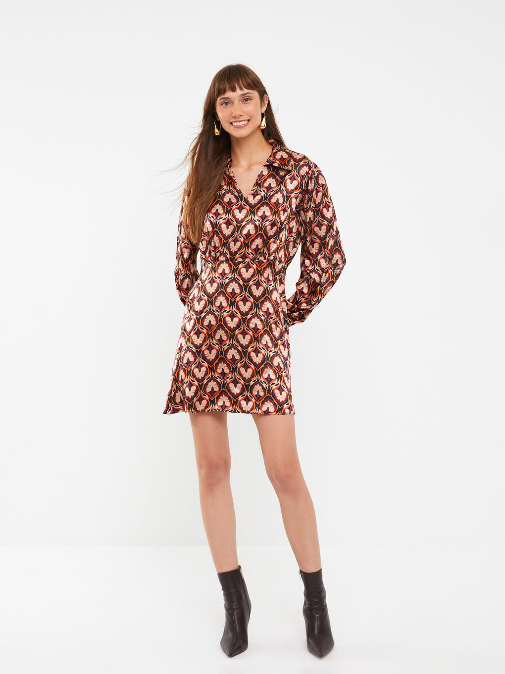 Shirt Neck Patterned Long Sleeve Satin Women's Dress