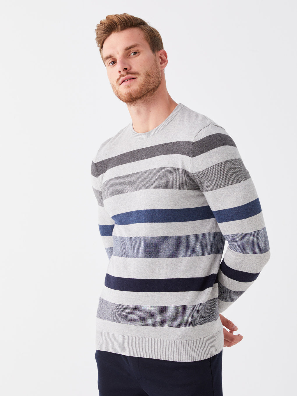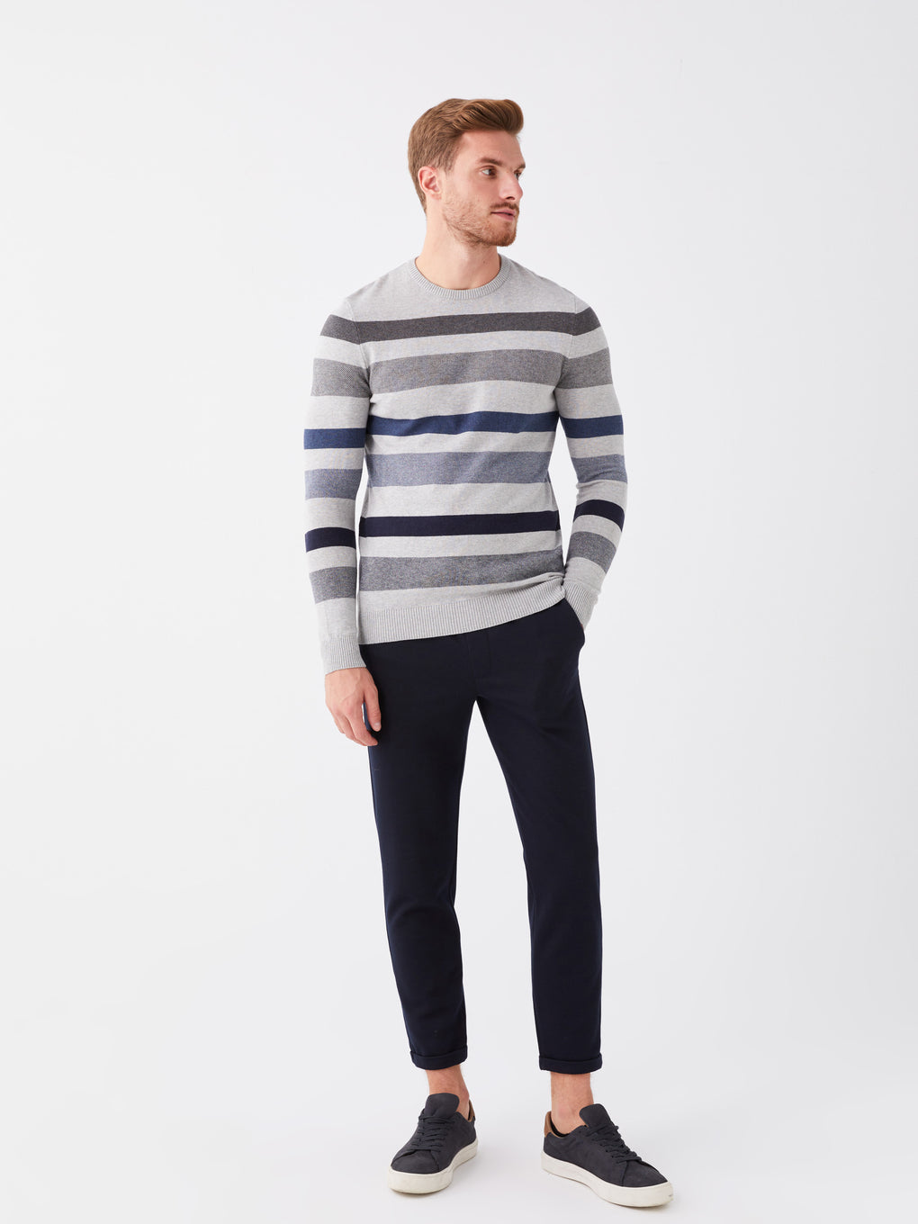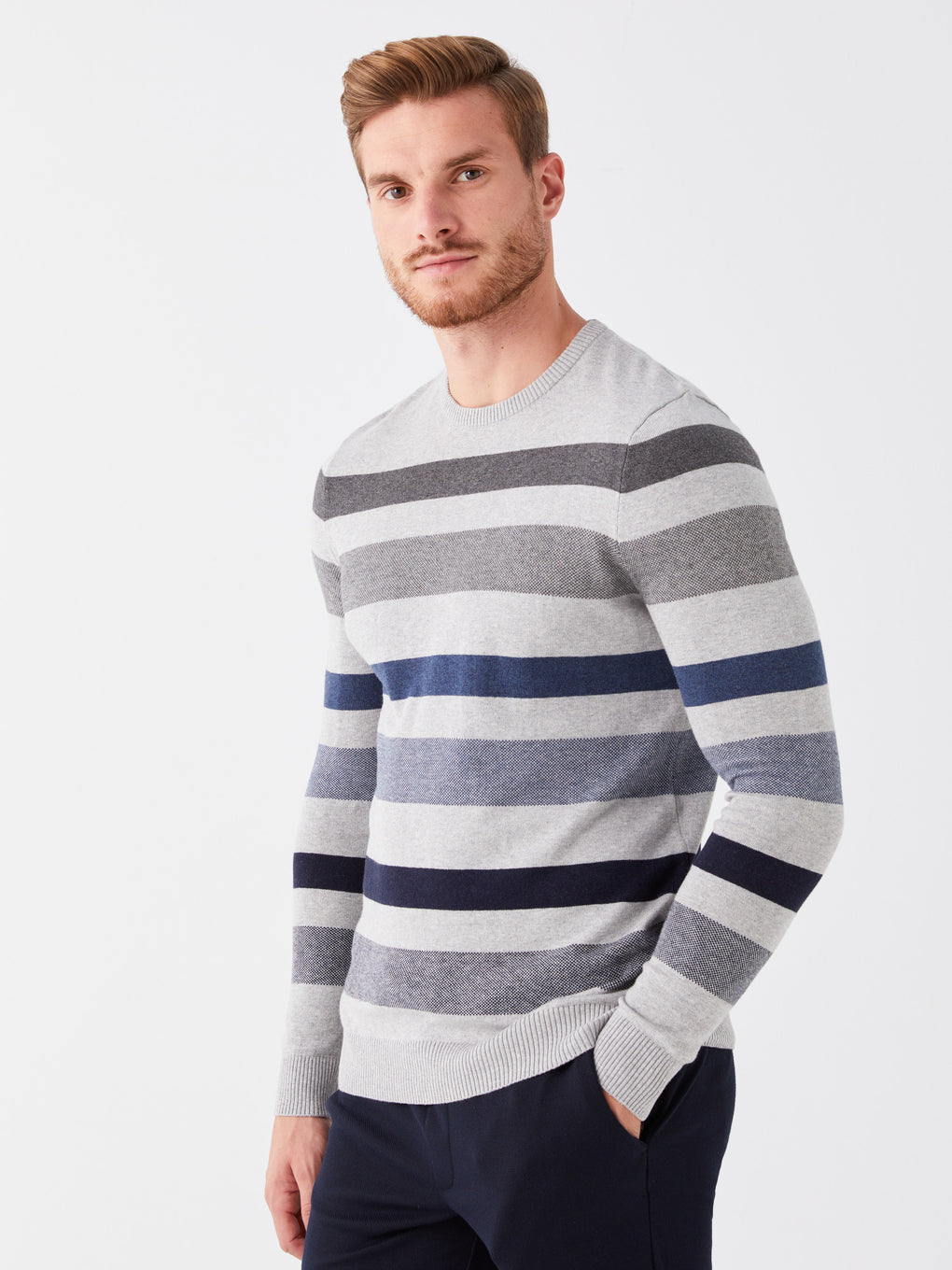 Crew Neck Long Sleeve Striped Men's Tricot Sweater
